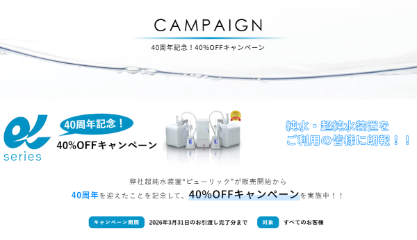 弊社超純水装置“ピューリック”が販売開始から40周年を迎えたことを記念して、40%OFFキャンペーンを実施中!!